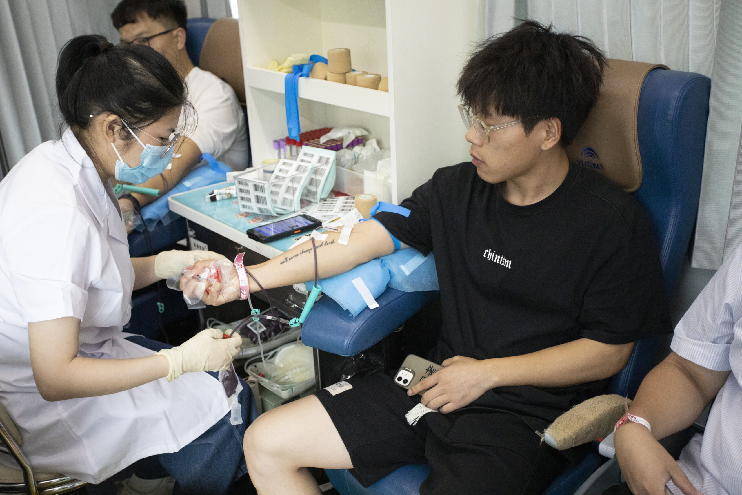 ? ? ? 血液達(dá)到符合規(guī)定標(biāo)準(zhǔn)的員工進(jìn)入采血車進(jìn)行獻(xiàn)血。他們中有每年都參與無償獻(xiàn)血的“老將”,也有初次上陣的“新兵”,醫(yī)護(hù)人員專業(yè)而耐心地為職工們服務(wù),確保每個(gè)環(huán)節(jié)安全可靠。